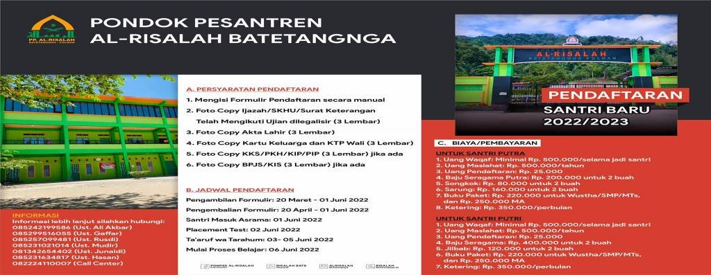 AYO MONDOK...... PENDAFTARAN SANTRI BARU PONDOK PESANTREN AL-RISALAH BATETANGNGA TAHUN AJARAN 2022/2023 A. PERSYARATAN PENDAFTARAN 1. Mengisi Formulir Pendaftaran secara manual bila … Read More …